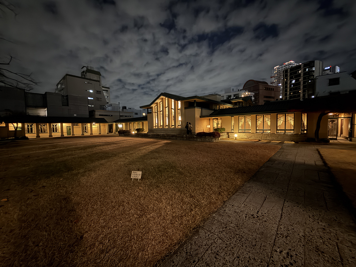 池袋の自由学園(フランクロイドライト設計)の夜景。
